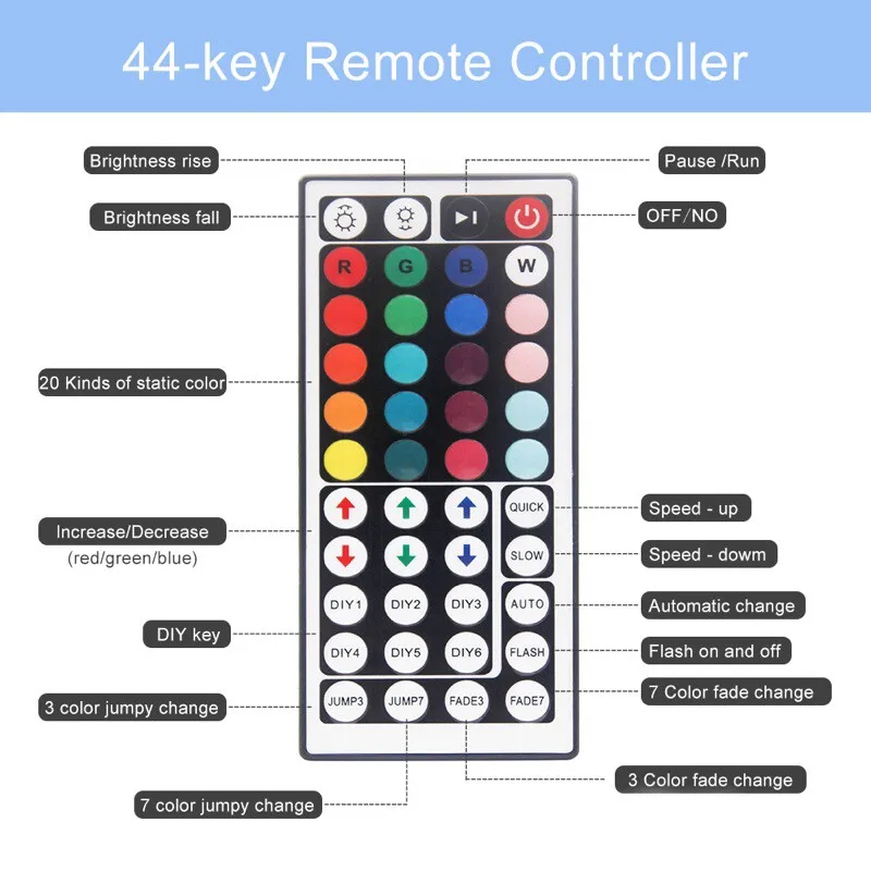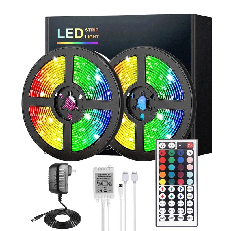 Package Contents: 2 * 5 meter/1 roll led strip 1 * IR Control Box 1 * 24key Remote Controller 1 * Power AdapterOnly the above package content, other products are not included.