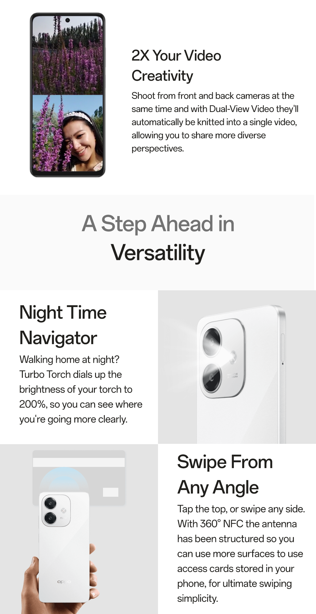 ○ Front: Video, Photo, Portrait, Night, Pano, Time-lapse, Sticker, Extra HD, Dual-view video