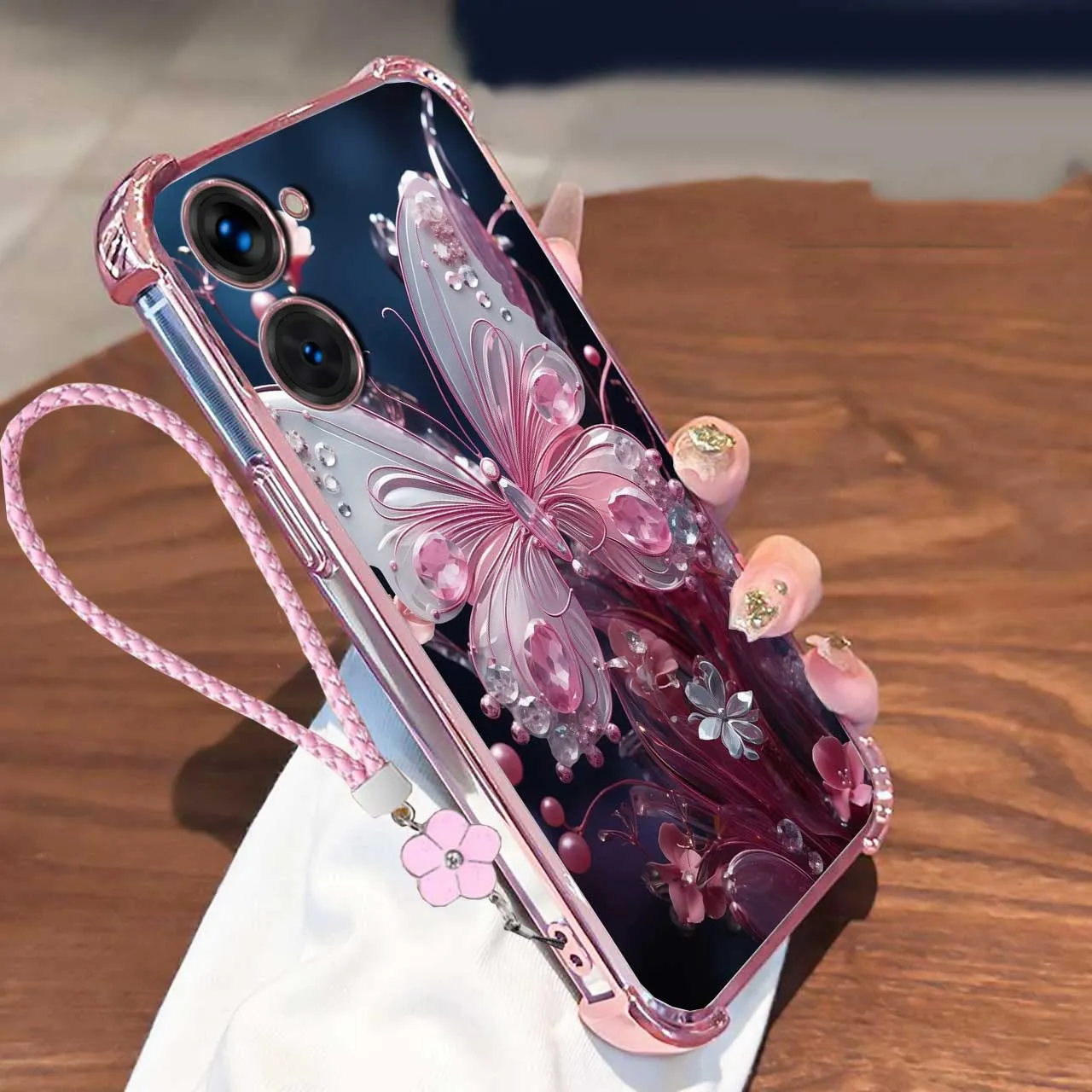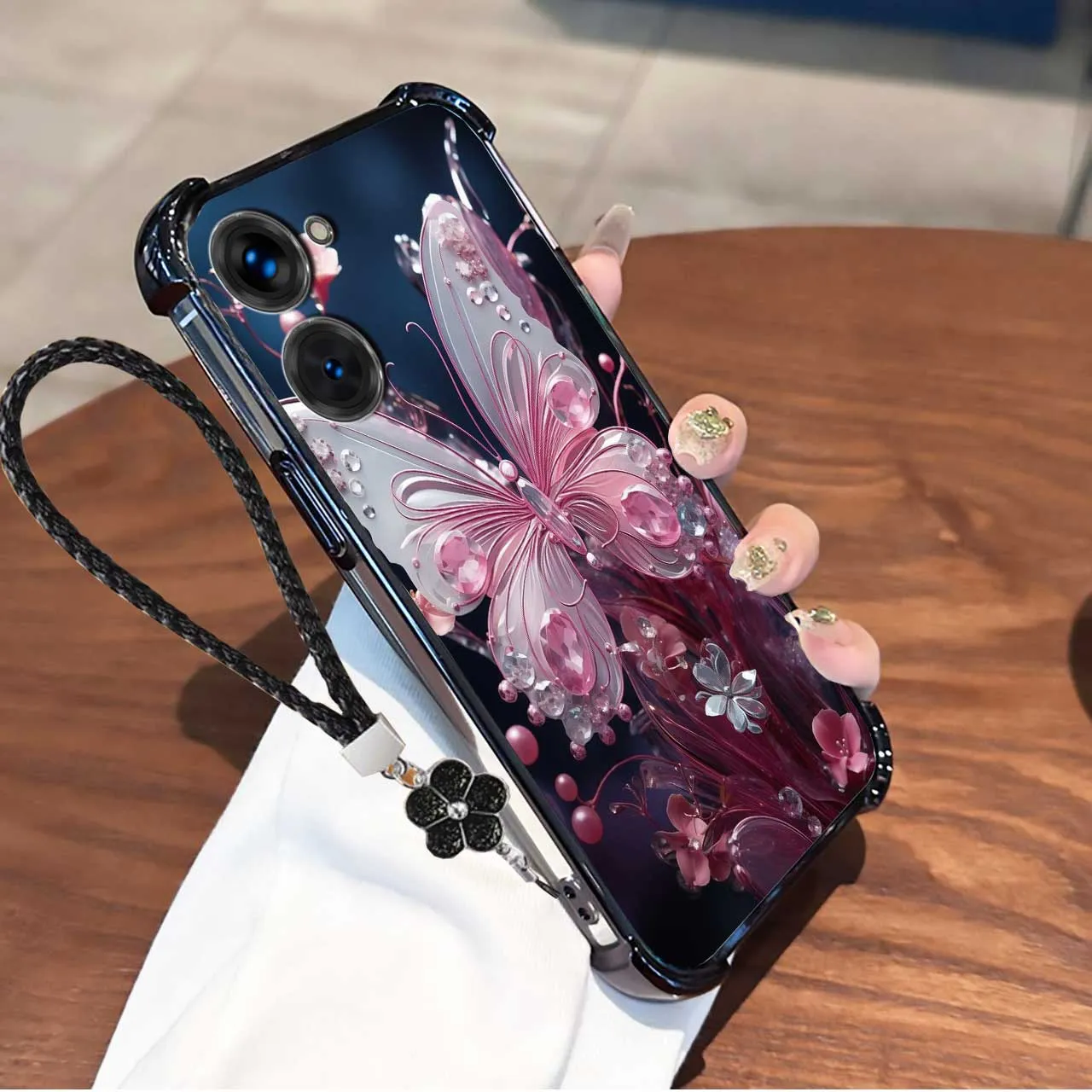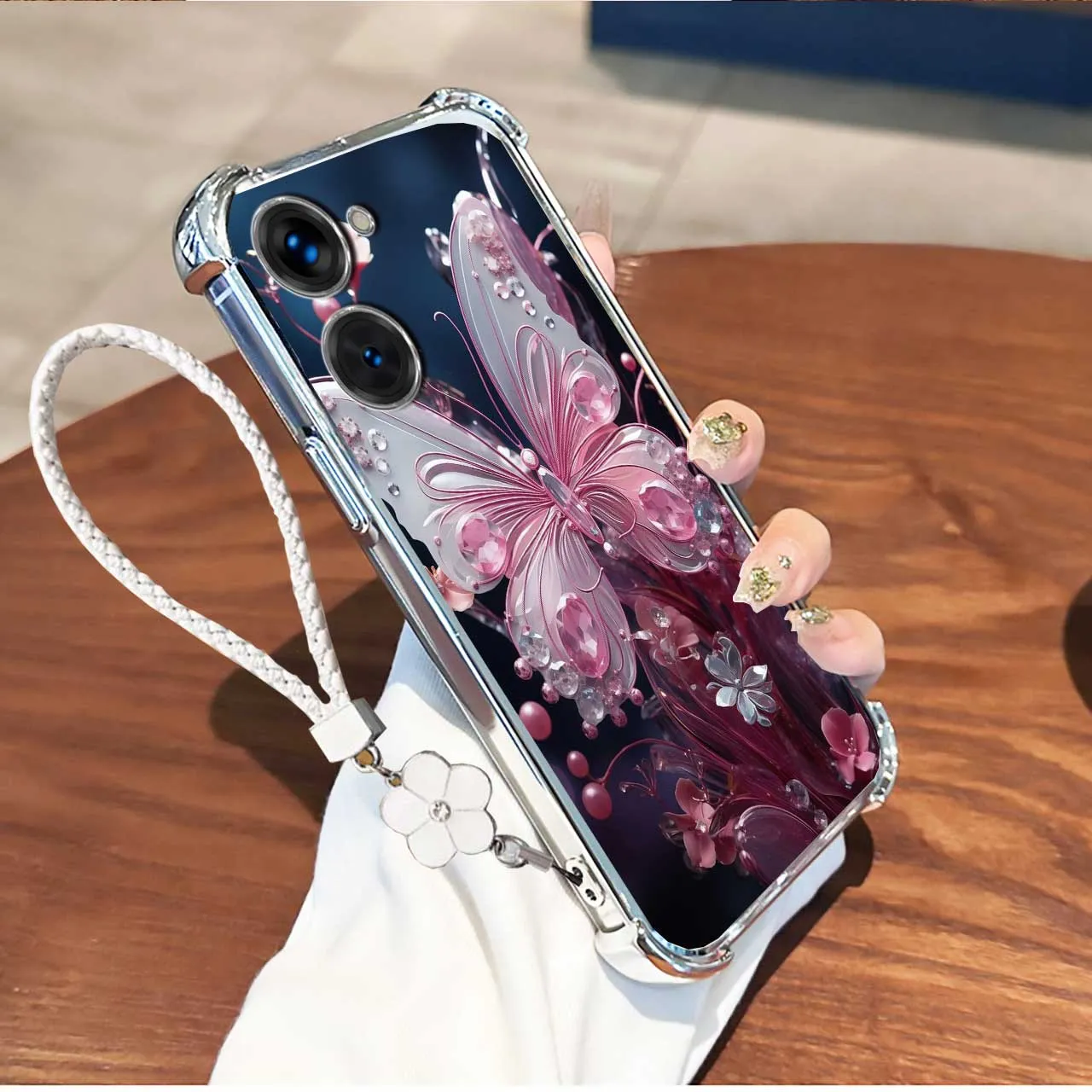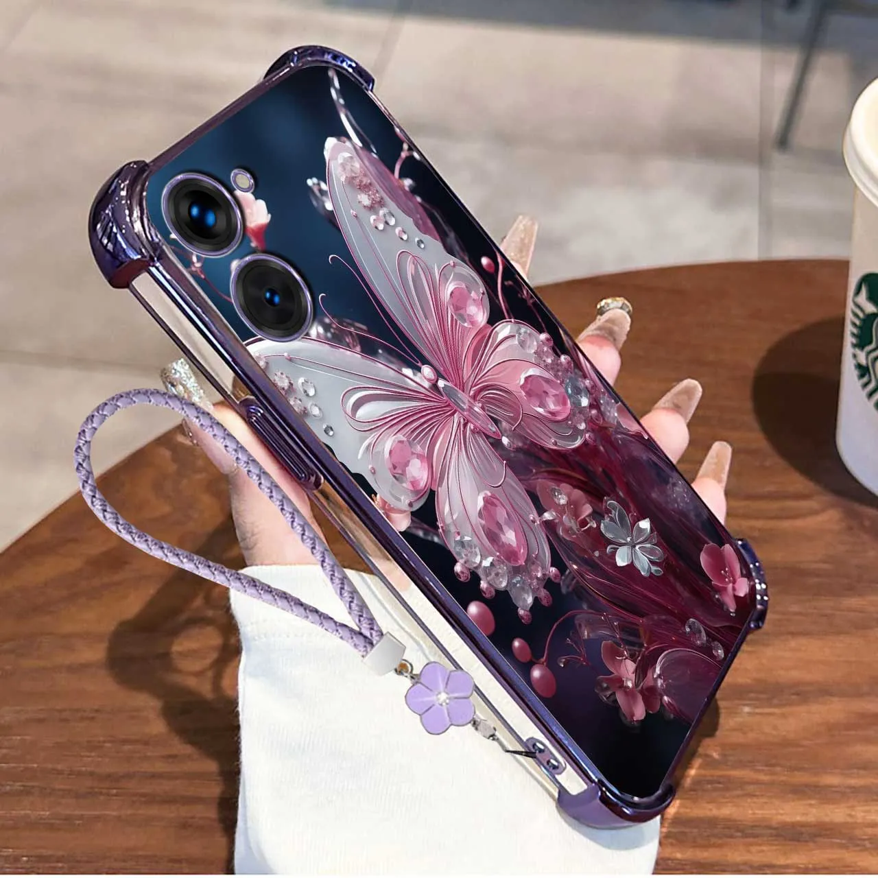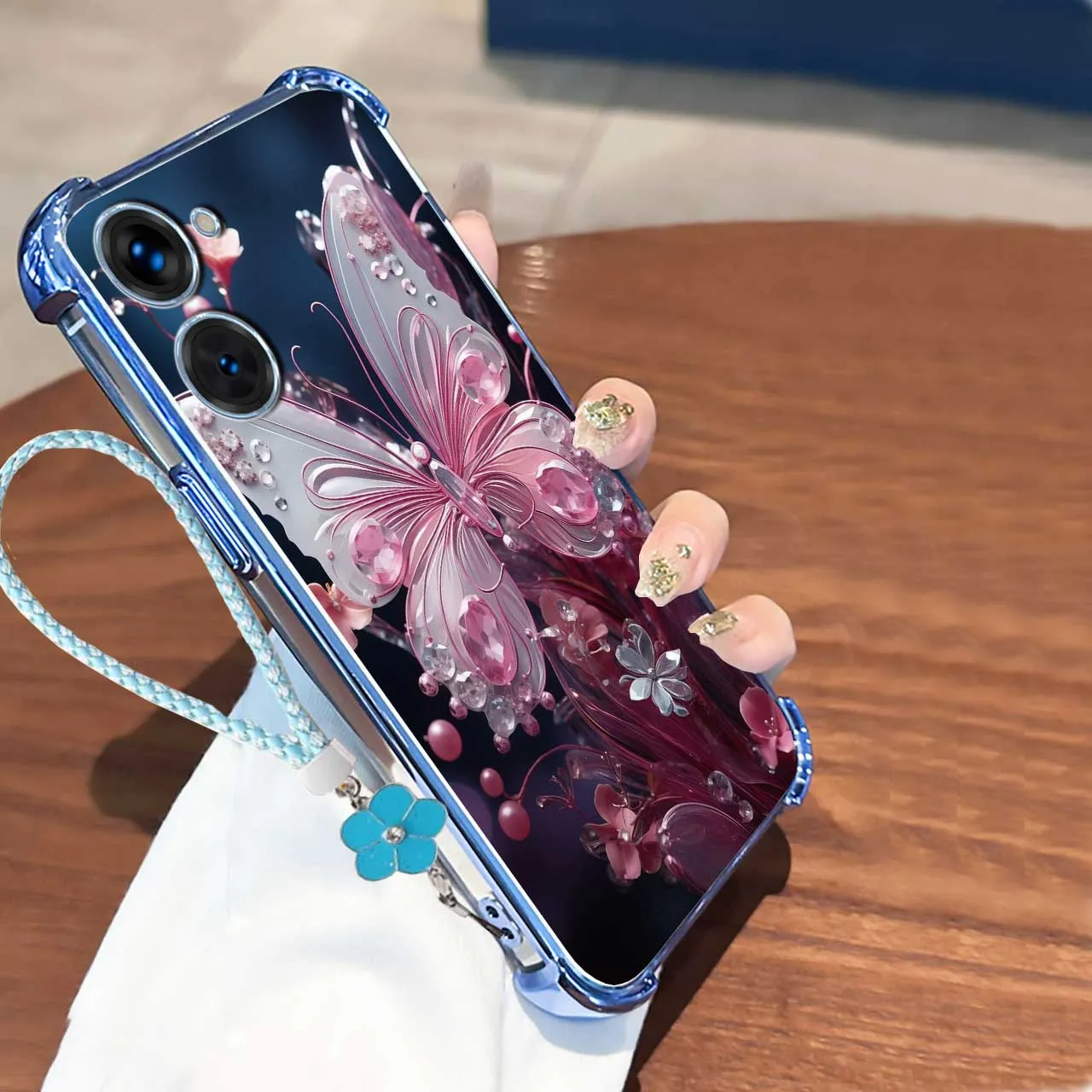 Casing For Vivo Y03 Y03t Y18e Y18 4G Y28S 5G V2332 Phone Cases Luxury Soft Silicone Four Corner Shockproof Case With Lanyard Water Light Butterfly Cover SJ104