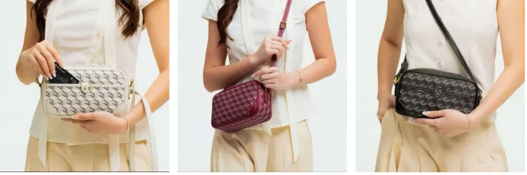 Authentic Christy NG crossbody bag in small size featuring geometric design with leather trim and gold hardware. Includes adjustable strap, dust bag, serial number card, and care instructions. Versatile style suits casual and formal occasions. Brand new condition.