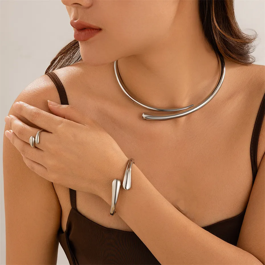 Ingemark Punk Water Drop Torques Choker Necklace Open Cuff Bangle for Women Wed Bridal Adjustable Rings Party Grunge Jewelry Set