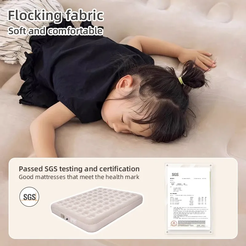 [Skin-friendly, waterproof and wear-resistant fabric] The surface is made of high-density flocking material, which is easy to clean and does not stick to hair. The internal PVC seal and bottom TPU layer further enhance the waterproof effect. Different from nylon sleeping pads on the market, the surface of our sleeping pad is flocked, which is not only skin-friendly and warm, but most importantly, it reduces the noise produced when turning over. Compared with other air mattresses on the market, the puncture resistance is increased by 95%, and the tear and wear resistance is increased by more than 50%.
