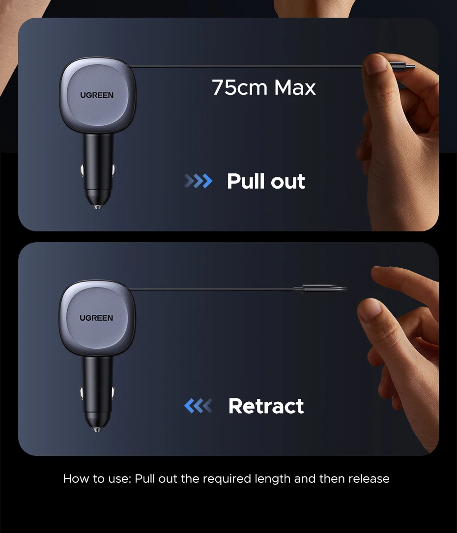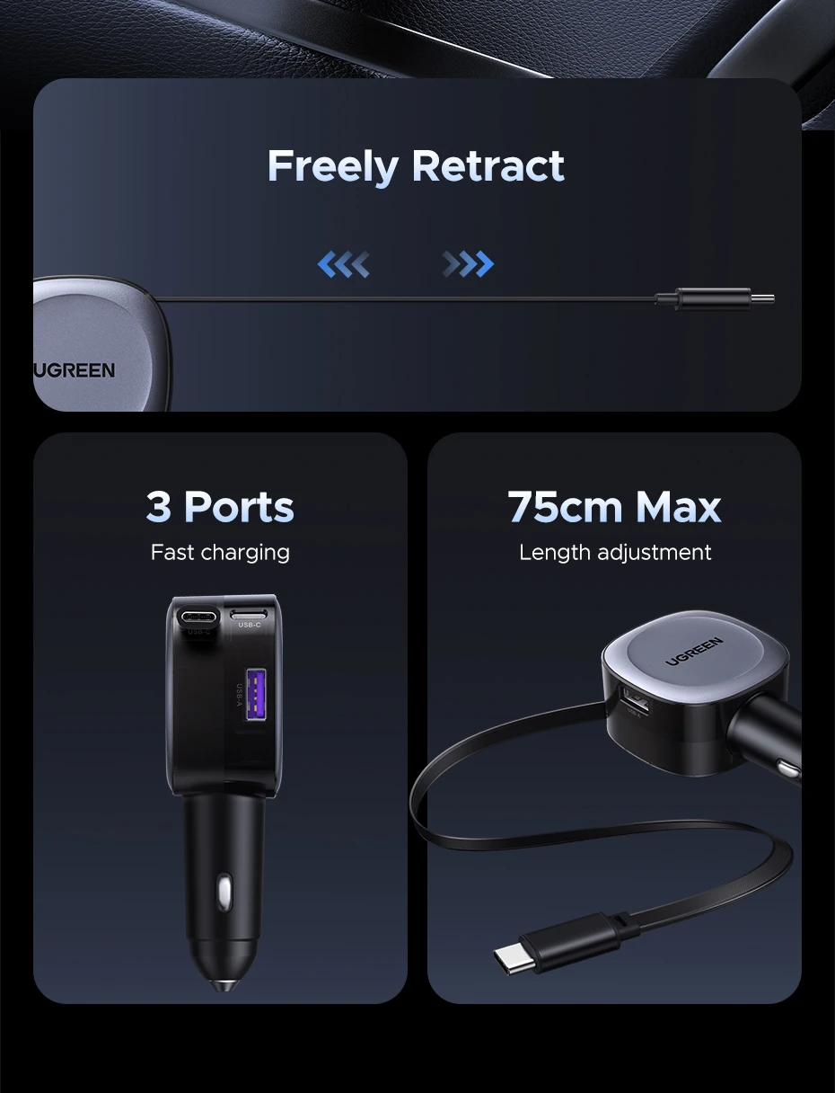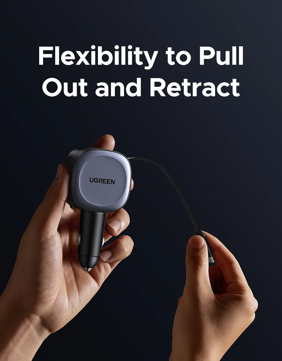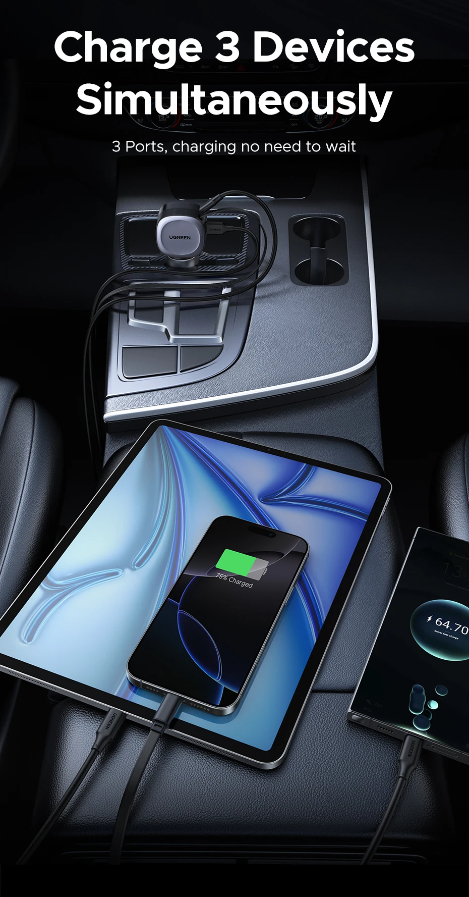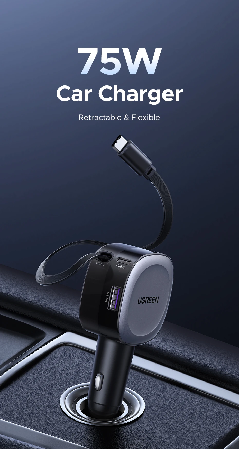 UGREEN 75W Car Charger 2 in 1 Retractable Cable SCP 25W QC PD 30W Fast Car Phone Charger For iPad iPhone 17 16 15 14 Pro Samsung