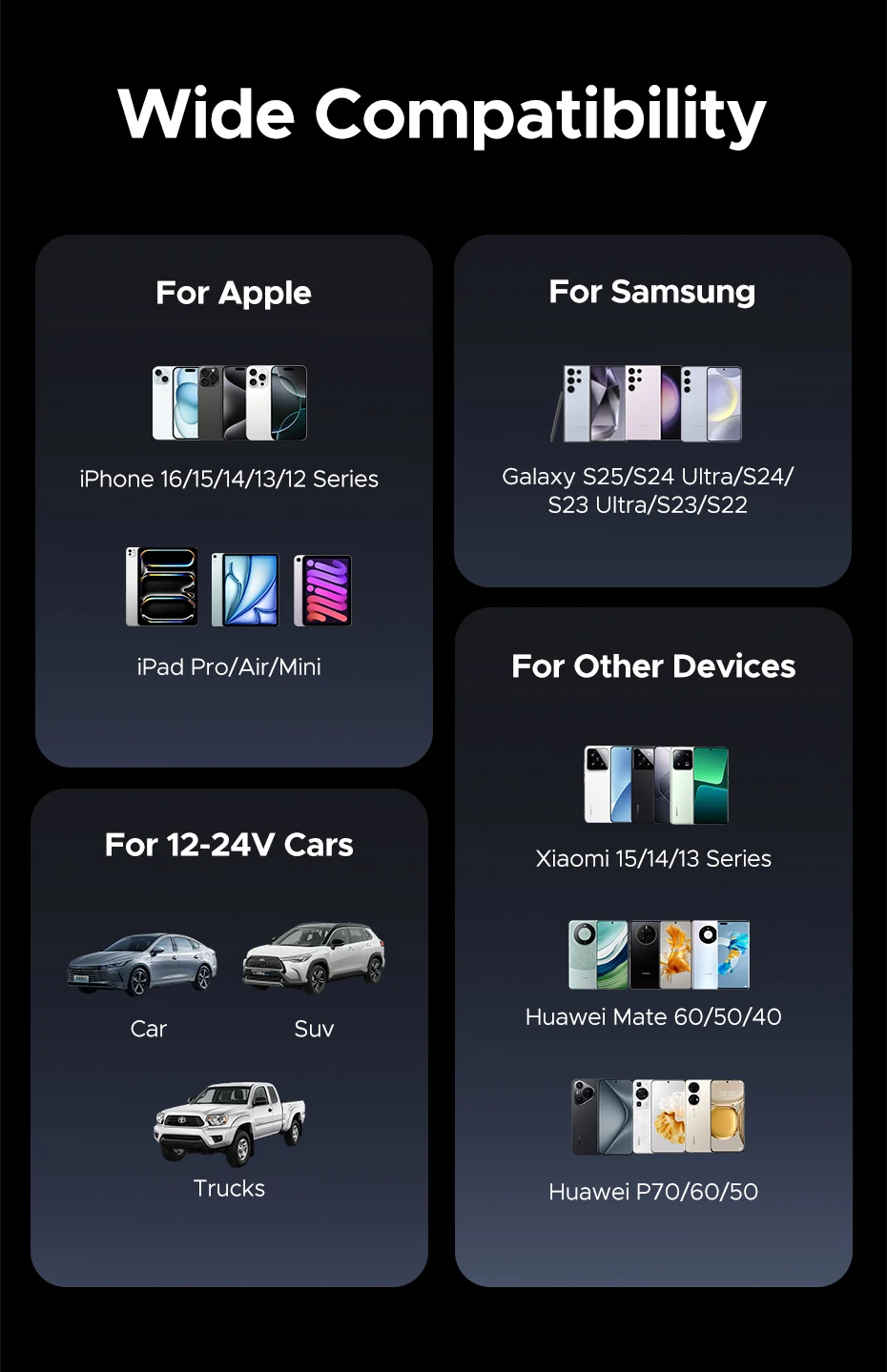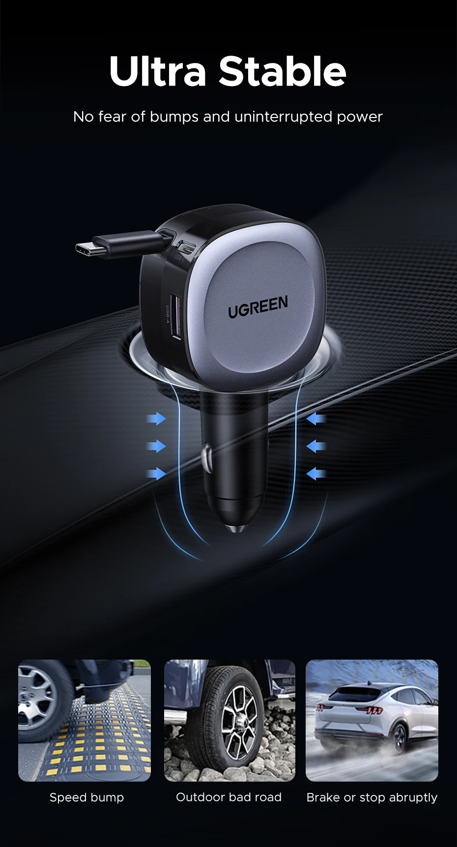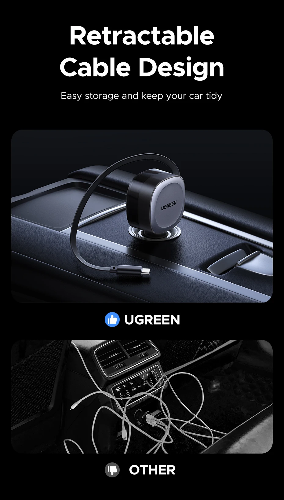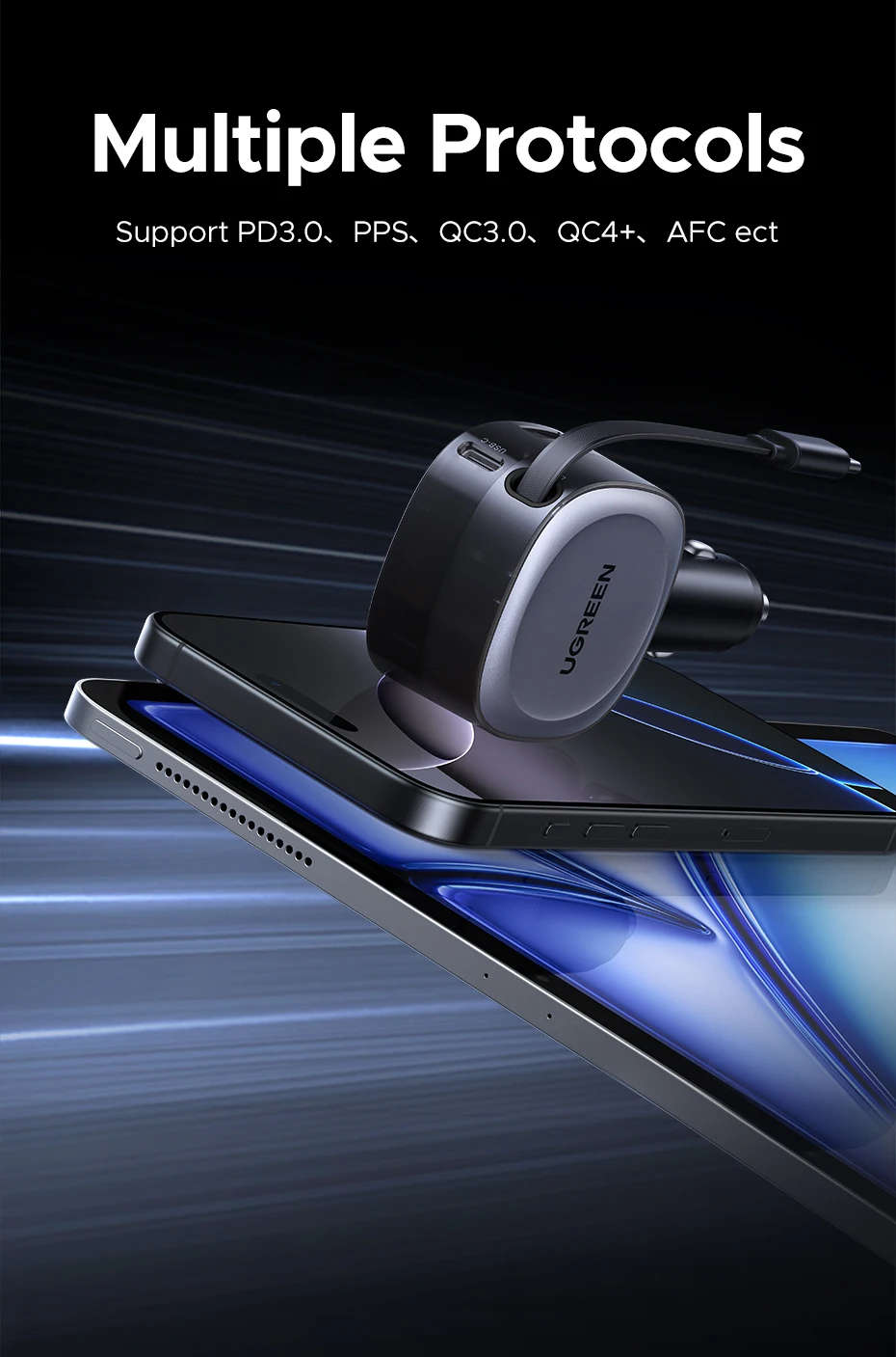 UGREEN 75W Car Charger 2 in 1 Retractable Cable SCP 25W QC PD 30W Fast Car Phone Charger For iPad iPhone 17 16 15 14 Pro Samsung